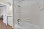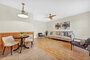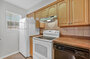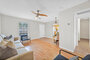Cozy and inviting, move-in ready 2-bedroom condo in the heart of Friendswood's downtown district! Tucked away in the tiny Leslie's Landing enclave, this immaculately kept second-floor unit offers a spacious family room with wood-look laminate floors & a modern lighted ceiling fan, spilling into a well-designed kitchen that makes the most of its small footprint. You'll find a smooth glass cooktop & electric oven, microwave shelf, dishwasher, fridge, wood cabinetry, and a roomy pantry. At the back of the home, find the utility closet, two bedrooms with wood-look laminate floors, and a shared bathroom with a single vanity and a combination bathtub and shower. From the family room window and exterior balcony, enjoy pool views. Plenty of parking is located behind the complex, and you're just a short walk from the library, Friends Church, Friendswood Grocery, numerous dining options, & the hub of activity in the downtown area. Hurry, this rare find in FISD won't last long!